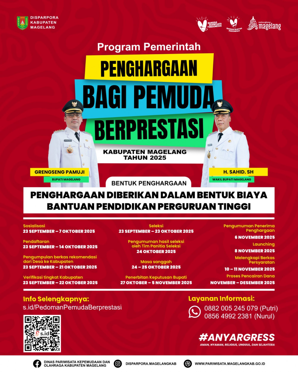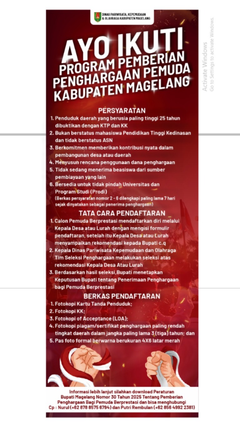 Pemerintah Kabupaten Magelang resmi meluncurkan Program Bantuan Biaya Kuliah Pemuda Berprestasi 2025 melalui Disparpora. Program ini dibuka untuk mahasiswa asal Magelang berusia maksimal 25 tahun yang memiliki prestasi akademik maupun nonakademik.