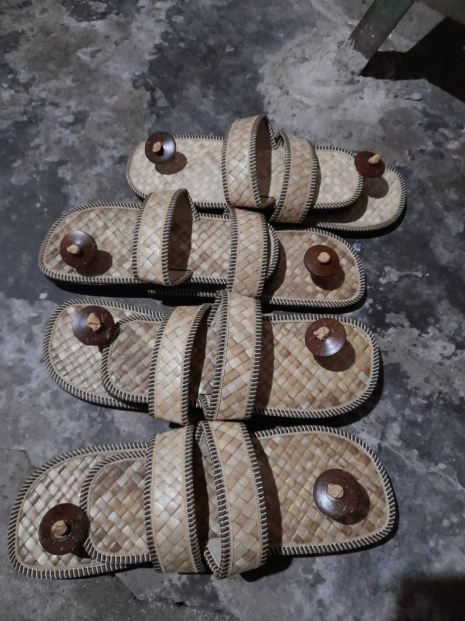 Tali dan permukaan atas sandal terbuat dari anyaman daun pandan, sedangkan penjepit bagian depan berasal dari batok kelapa.